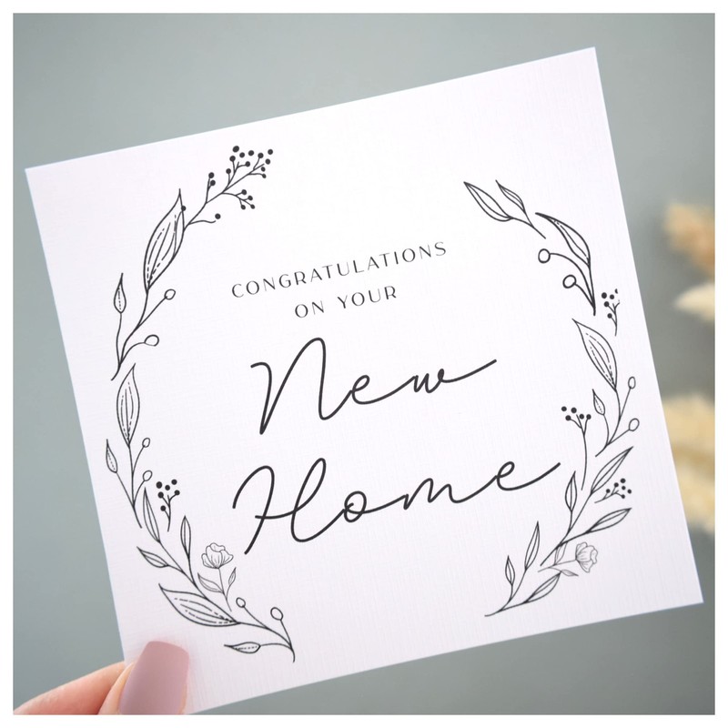 New Home Card | Congratulations New Homeowners Card | Card for Friend sister Mum Colleague | Monochrome Classy Floral Wreath | 148mm Square Modern Greeting Card