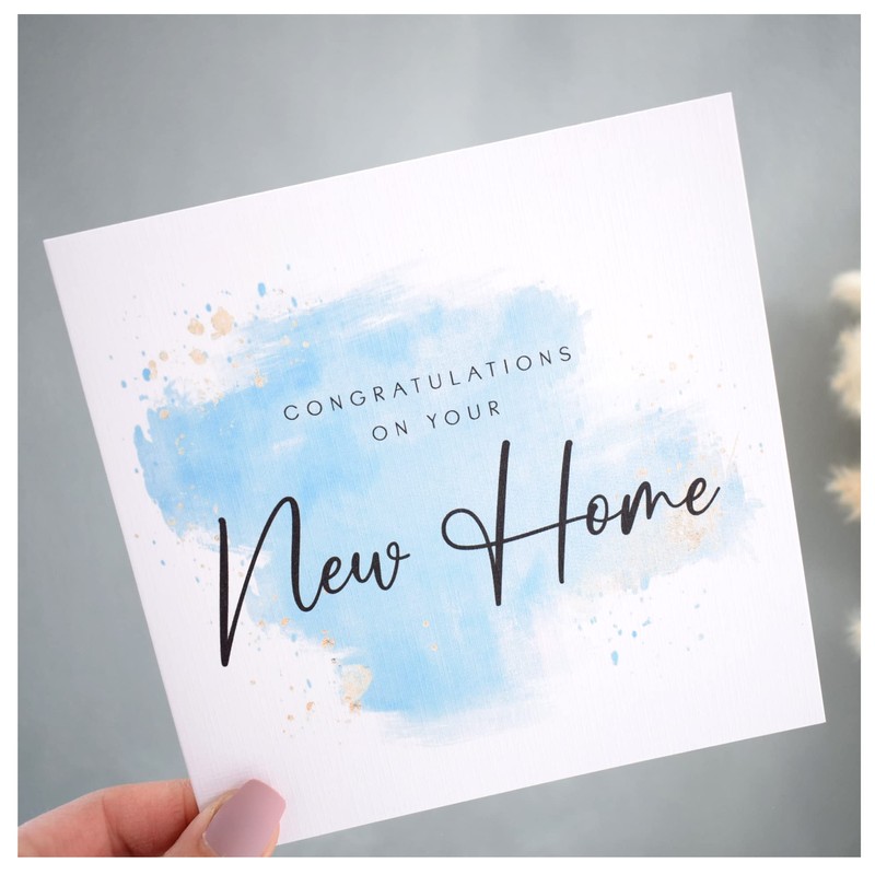 New Home Card | Congratulations New Homeowners Card | Card for Friend sister Mum Colleague Neighbour | Watercolour Blue Gold | 148mm Square Modern Greeting Card