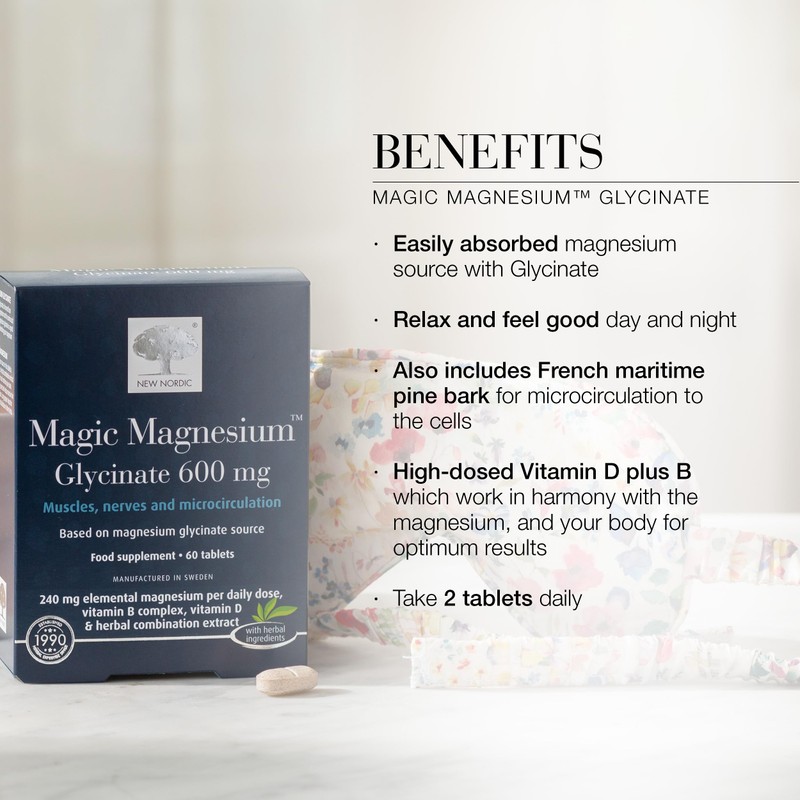 New Nordic Ltd New Nordic Magnesium Glycinate - 600 mg Extra Strength - Sleep & Muscle Support for Women & Men - Pine Bark & Long Pepper Extract - 60 Tablets