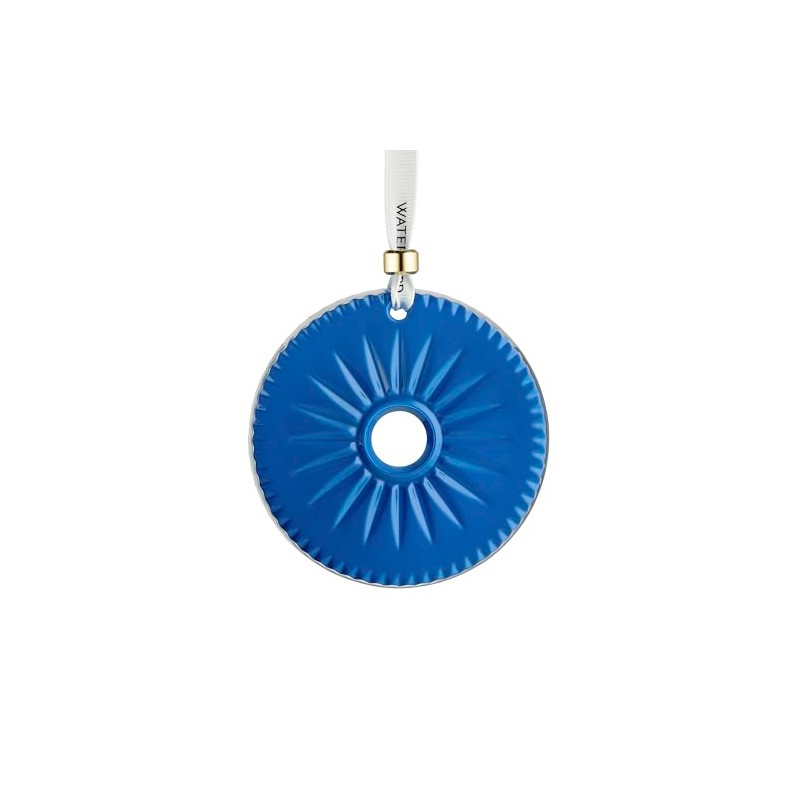 - Striking blue crystal disc ornament, designed to mark the New Year. Radiant cuts extend from the center, creating a festive, eye-catching effect.