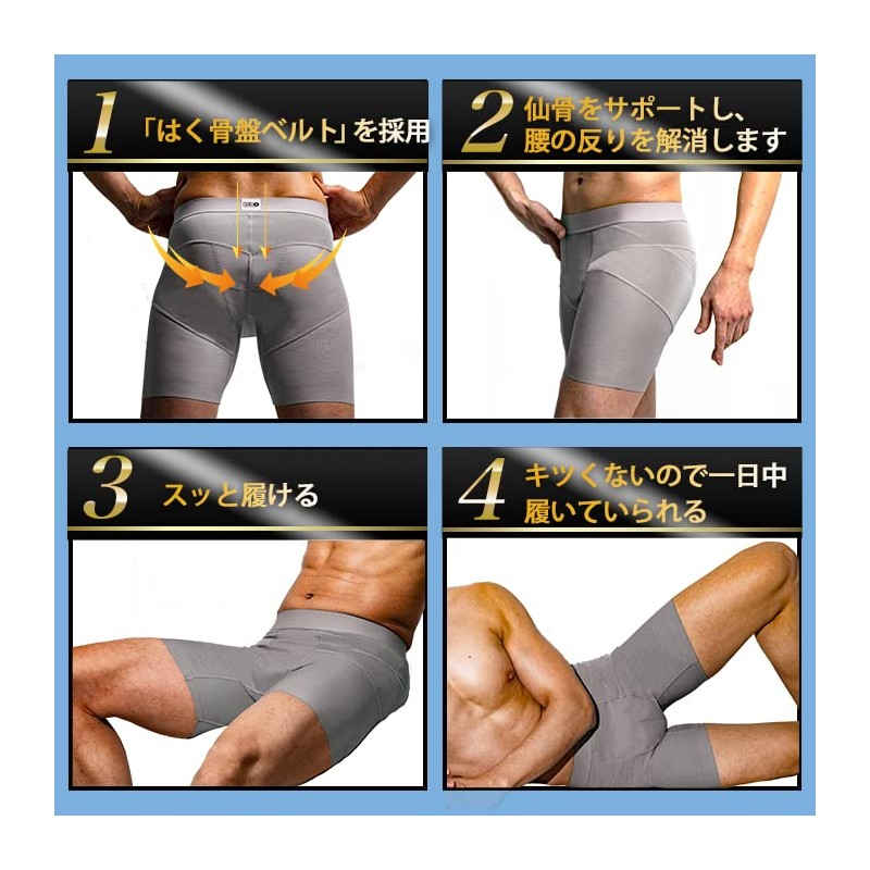 - ▶▶2023年新色グレー。前面から背面に骨盤を立てる特許取得技術のオリジナルV字パワーネットを採用。ベルト内蔵のかさばらないシンプルさで、着用時に骨盤・腰まわりを支えるメンズ骨盤パンツ。