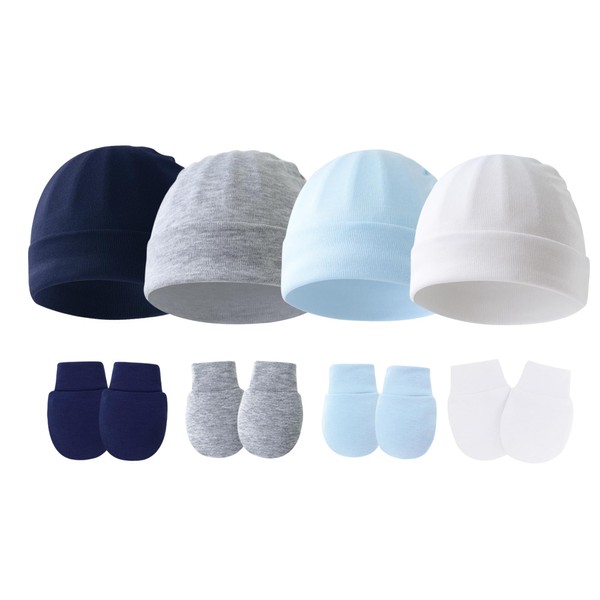 Newborn Baby Hats Mittens Set for Boys and Girls Unisex Toddler Warm Hospital Hat and Gloves White/Navy Blue/Gray/Blue for 0-6 Months