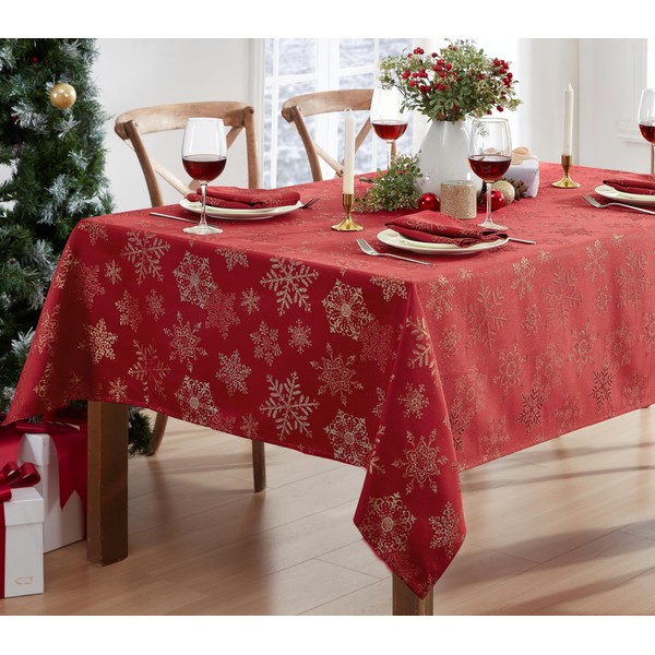 - Newbridge Fancy Metallic Snowflake Christmas No-Iron Soil Resistant Fabric Holiday Tablecloth, Sparkling Snowflakes Lurex Woven Easy Care Tablecloth, 60 Inch x 144 Inch Oblong/Rectangle, Red/Gold