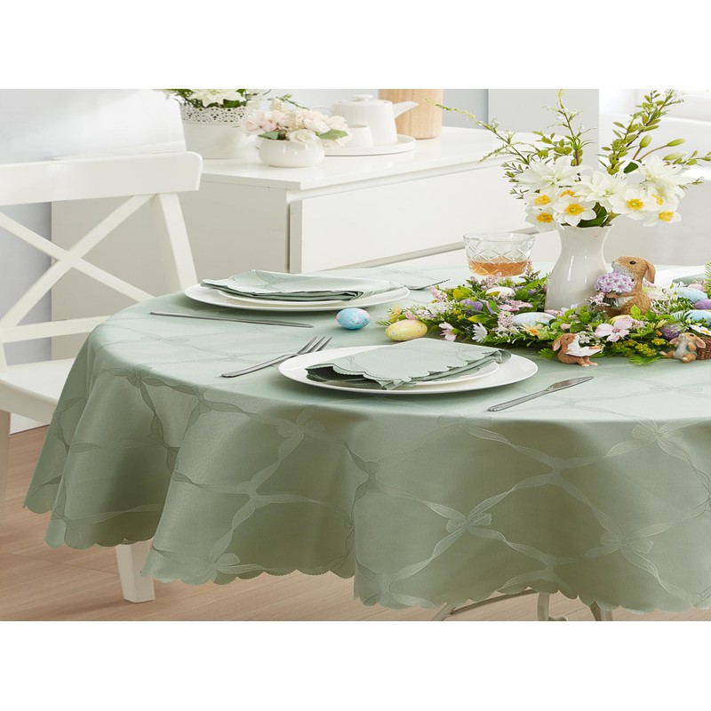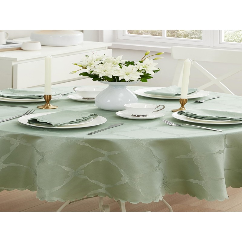 - Styling: The Newbridge Ribbons and Bows Scalloped Damask Fabric Tablecloths feature a classic allover woven lattice design featuring woven streaming ribbons and bows damask design with a subtle visual texture.