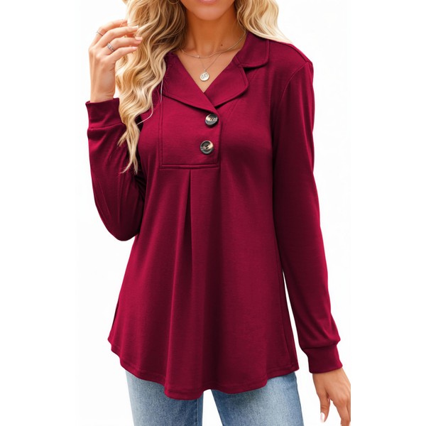 Newchoice Women Fall Long Sleeve Shirts Tops,Casual Winter Clothing Collar V Neck Tunics Or Tops To Wear With Leggings(Berry Red.M)