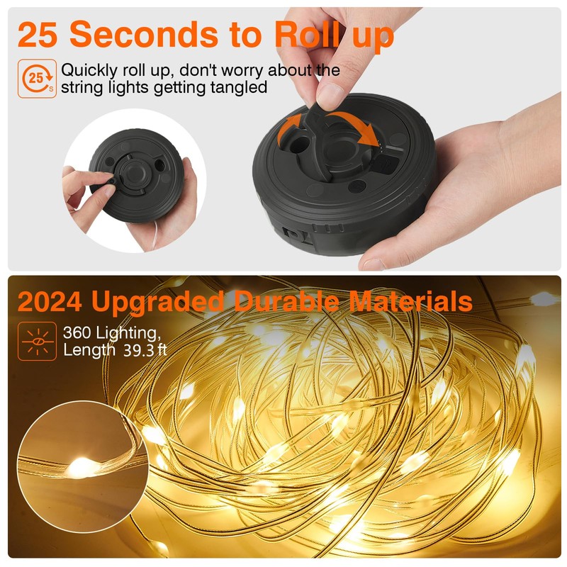 NEWCITY Camping String Lights, 2 in 1 Outdoor String Lights with 9 Lighting Modes, Quick Storage, Durable and Waterproof, USB Charging, Rechargeable String Lights for Camping Yard Hiking (39.3ft)