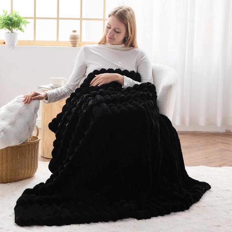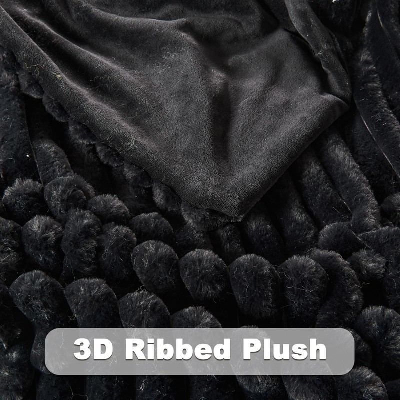 NEWCOSPLAY Faux Fur Throw Blanket Black 3D Ribbed Plush Thick Warm Blanket for Couch Sofa Bed 850GSM (Black Ribbed, Throw(50"x60"))