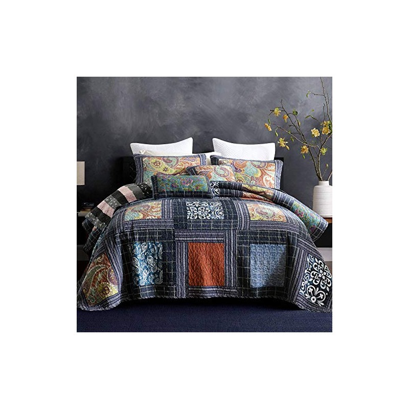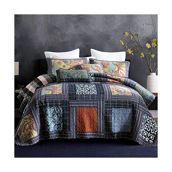 NEWLAKE Bedspread Quilt Set with Real Stitched Embroidery, Paisley Grid Patte...