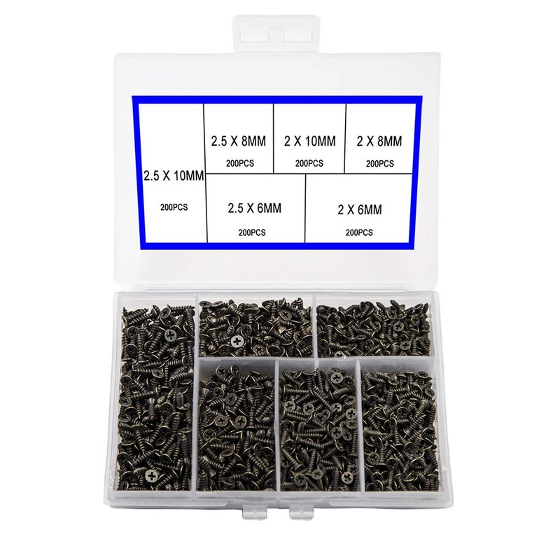 - 🔨Tiny Screw classification box: 2X6mm/2X8mm/2X10mm/2.5X6mm/2.5X8mm/2.5X10mm, each 200PCS, a total of 6 kinds of 1200PCS. Color: Bronze, material: iron.Screws are small, in millimeters, please be careful to buy(1 mm = 0.0393701 inches)