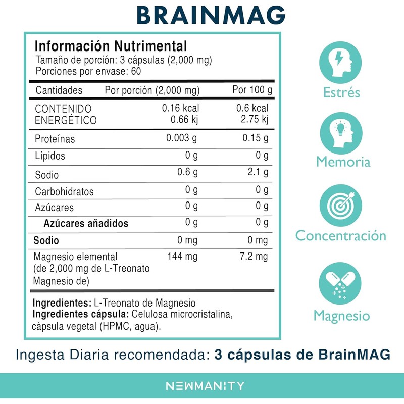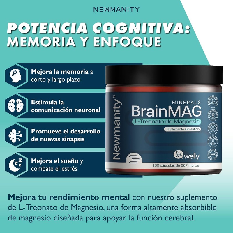 NEWMANITY BrainMAG Treonato de Magnesio - 180 Cápsulas de Alta Absorción, Suplemento Nootropico para Concentración, Memoria, Relajación, Sueño y Bienestar Mental, Fórmula de L-Treonato de Magnesio
