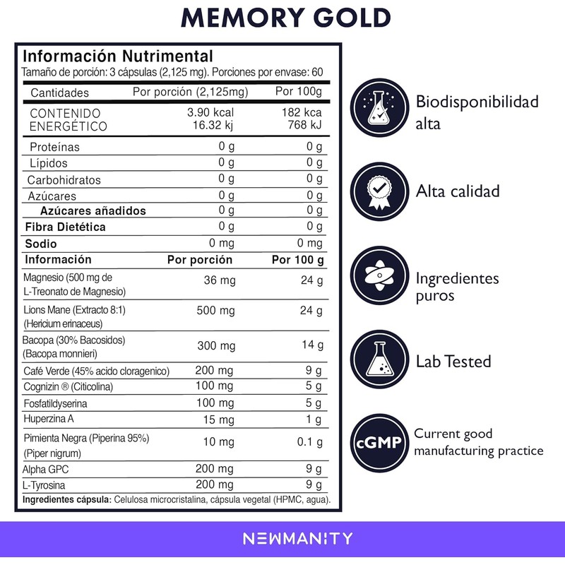 - Calidad y Pureza Garantizadas: Elaborado bajo estrictos estándares de calidad, NEWMANITY asegura que cada cápsula de Memory Gold es libre de aditivos nocivos y apta para quienes buscan un apoyo cognitivo confiable.