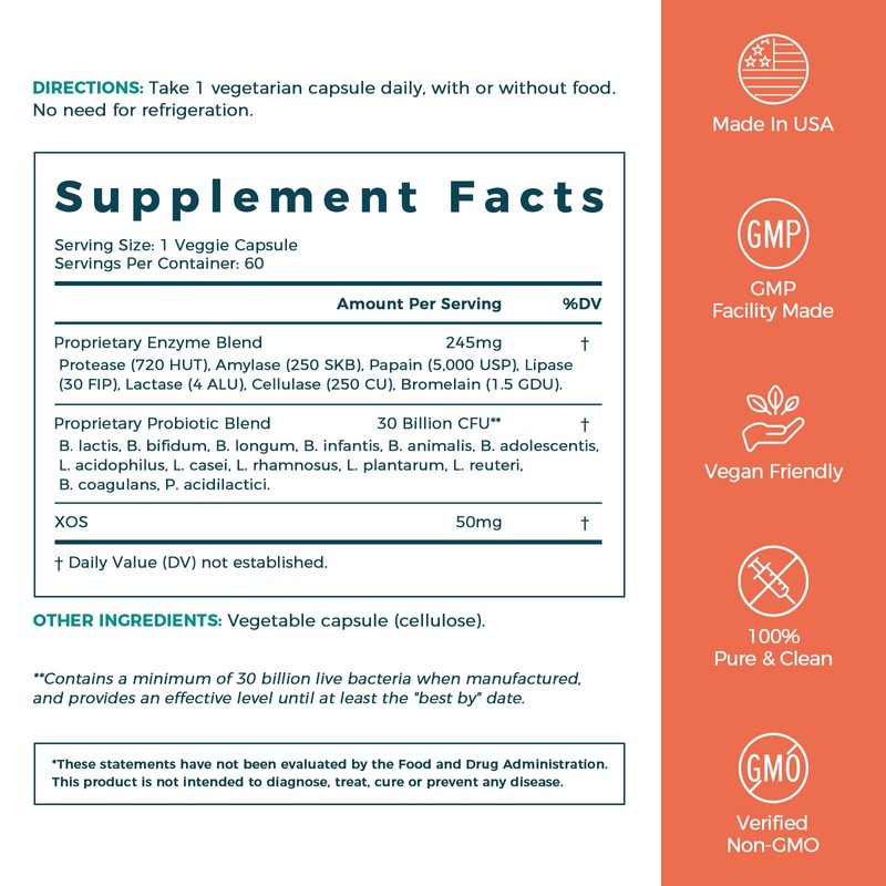 • Kiss Digestive Woes Goodbye: Beat the bloat & say goodbye to mealtime discomfort with our triple action digestion support!* Multi digestive enzymes aid with breaking down hard-to-digest foods that can trigger occasional tummy troubles while probiotics and prebiotic work together to maintain gut flora balance for better nutrient absorption.* Love what you eat again and keep enjoying your favorite meals without unbuckling your pants