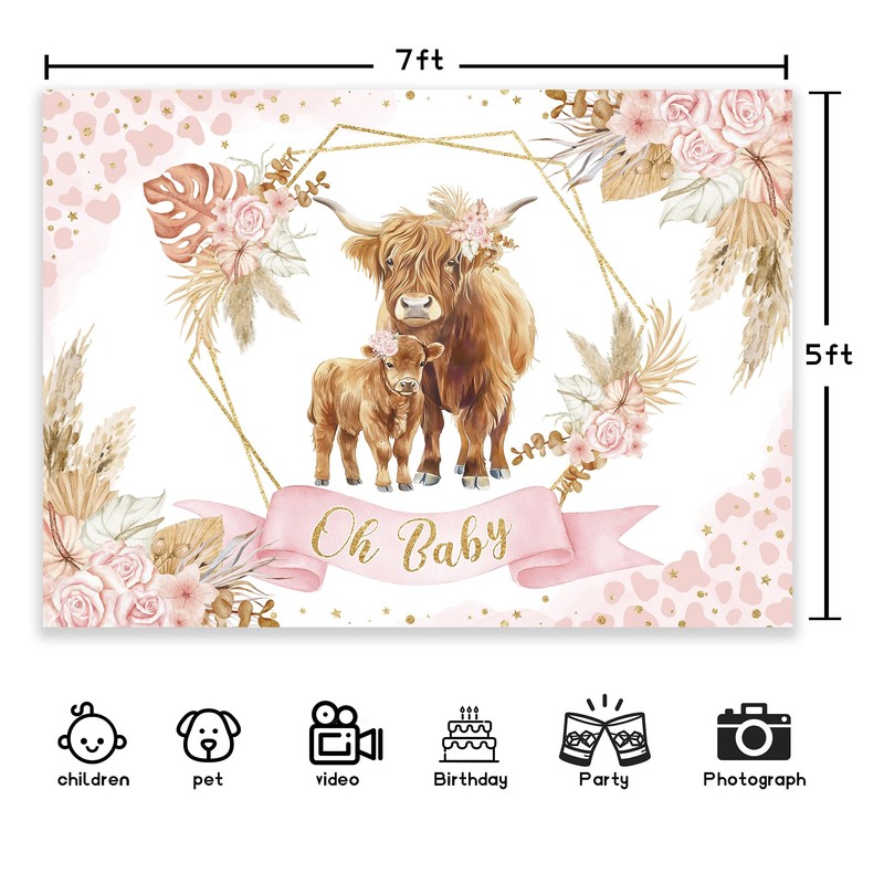 Newsely Highland Cow Baby Shower Decorations Backdrop 7Wx5H Photography Boho Pink Rose Floral Pampas Grass Cute Animal Sweet Girls Newborn Background Aesthetic Party Banner Photo Booth Props Supplies