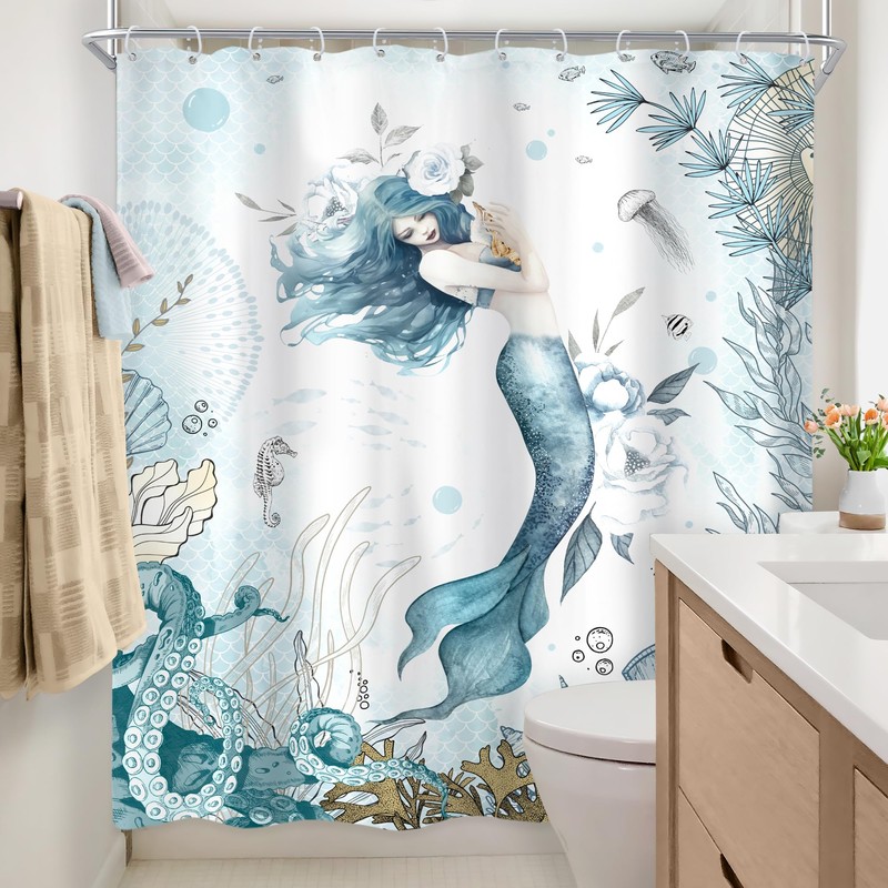 Newsely Mermaid Shower Curtain 72Wx72H Inch Nautical Blue Sea Ocean Octopus Coral Underwater Fish Seashell Jellyfish Shower Curtain Bathroom Set Teal Waterproof Bath Decoration Accessories Home Decor