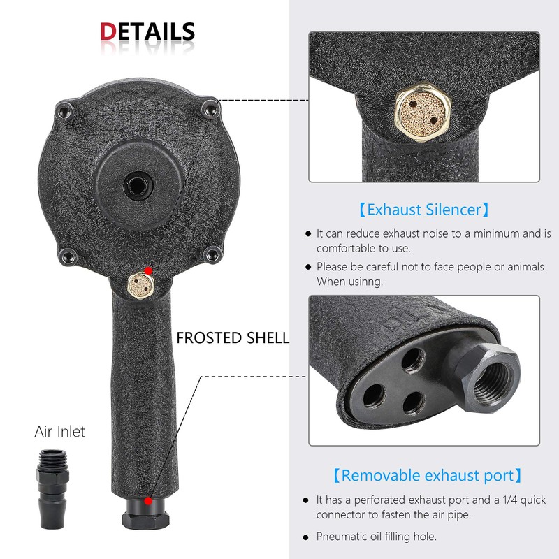 - ▷ [EXHAUST MUFFLER PORT & 360° ROTATING PUINCH]---Inlet size: 1/4"; the perforated gun body has an exhaust muffler, which can reduce the exhaust noise of the punch and provide you with more comfort work environment, but it is still recommended to wear headphones to protect your ears when using it. The punch of the air punch can be rotated 360°at any angle, The firing pin is forged from a special alloy steel material, which is durable and has sharp impact.