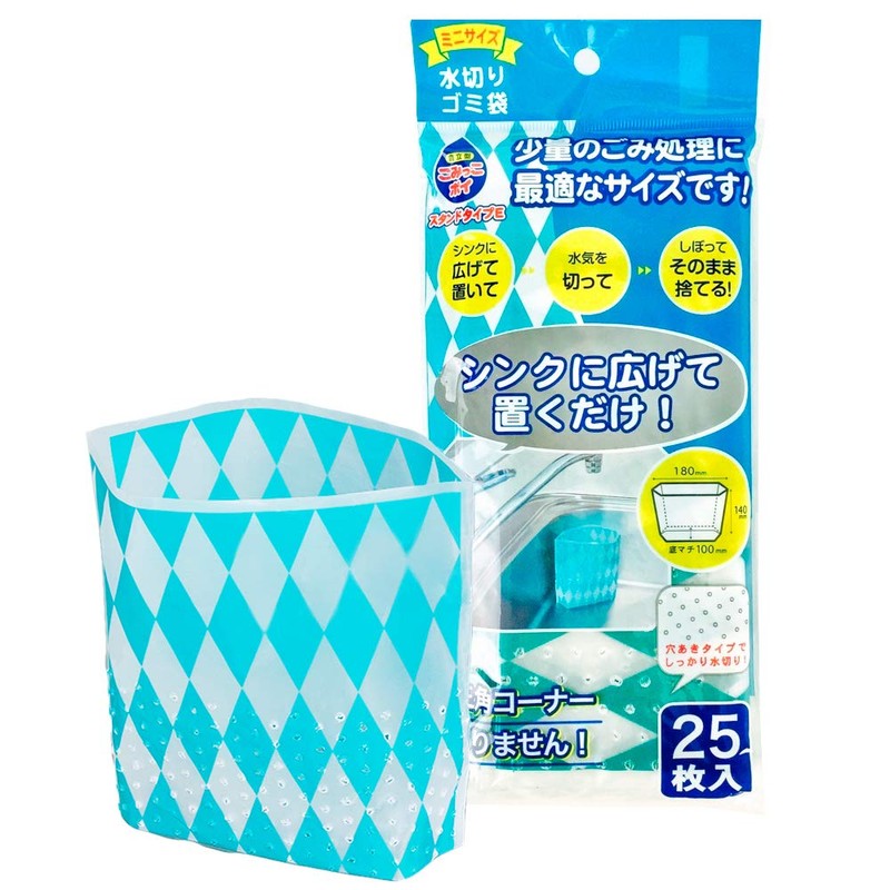 Nexta Freestanding Draining Garbage Bags, Gomibakko Boy, Mini Diamond Pattern, H x W x Bottom Gusset Approx. 7.1 x 3.9 x 5.5 inches (18 x 14 x 10 cm), Just Open in the Sink, Mesh Bottom Design, Pack of 25