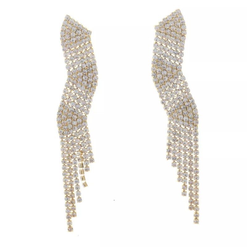 Gold Tone Metal Rhinestone Dangle Post Earrings / Approximate Size: 3.25" L x 0.5" W / Rhinestone / Metal / Lead & Nickel Compliant / Color: Gold & Clear
