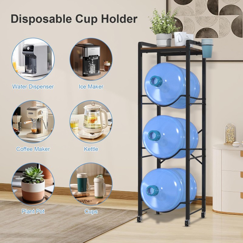 NEYCIL 5 Gallon Water Jug Holder, Heavy Duty Water Jug Stand with Lockable Wheels, 3-Tier Water Jug Rack with Wooden Tabletop for Home, Office, Kitchen, Restaurant