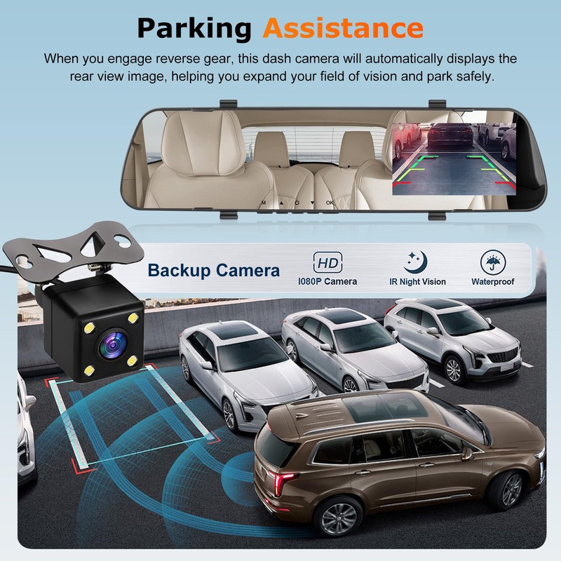 - Parking Assistance: This rear view mirror dash cam has a parking assist function. When the reverse gear is engaged, it will automatically switch to a rear view image with parking assist lines. Eliminate rear view blind spots. Make driving and parking safer and easier.