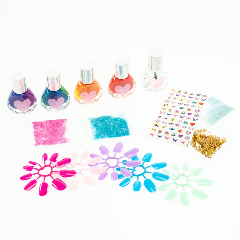 - Package includes: 4 x Colour Changing Nail Polish, 1 x Clear Nail Polish, 5 x False Nails, 1 x Sheet of Stickers, 4 x Glitter/Sequin Pouches, 1 x Instruction English language not guaranteed). Recommended age: 8 years and above