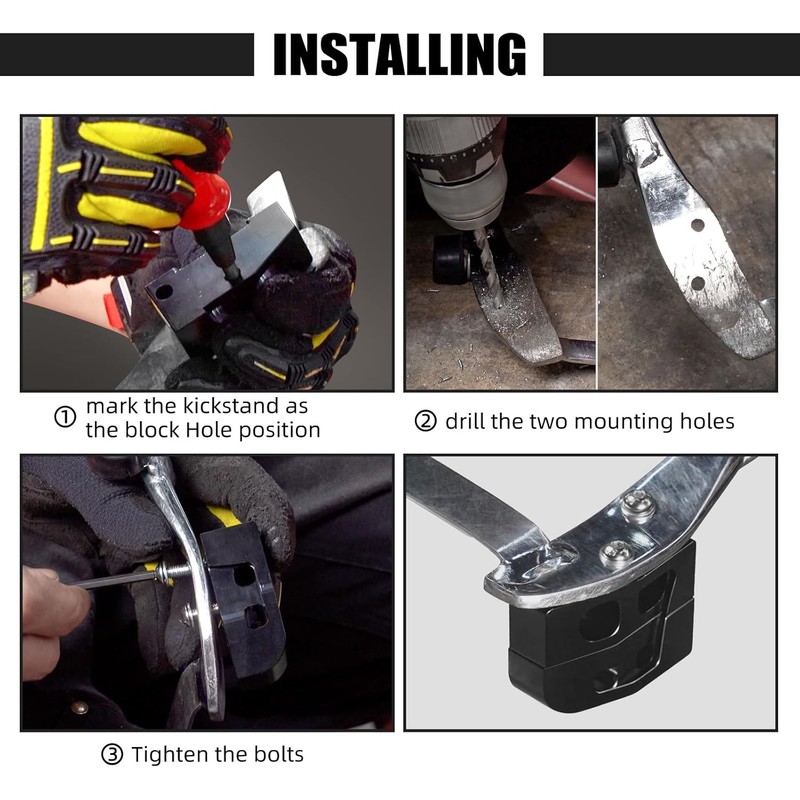 - Install with ease: Mark your kickstand, drill the two mounting holes, and secure the Kickstand Lift Block in place for enhanced bike stability.