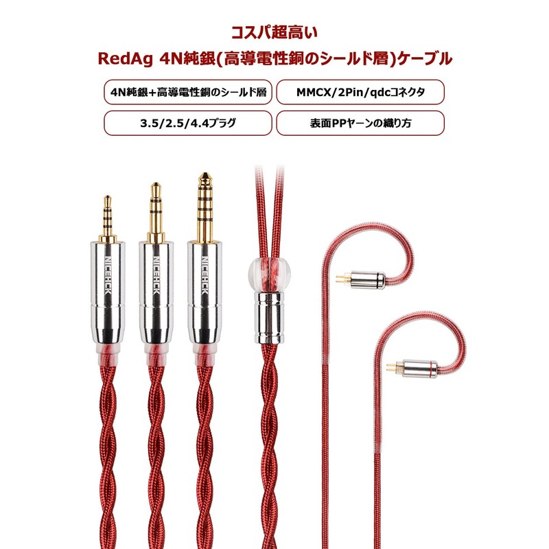 - RedAg cable surface adopts red PP yarn braid for aesthetic durability; MMCX, 0.78 2Pin and qdc 2Pin version, 3 kinds of connectors to choose from,2.5mm,3.5mm,4.4mm 3 kinds of plug to choose,compatible with most earphone and DAP
