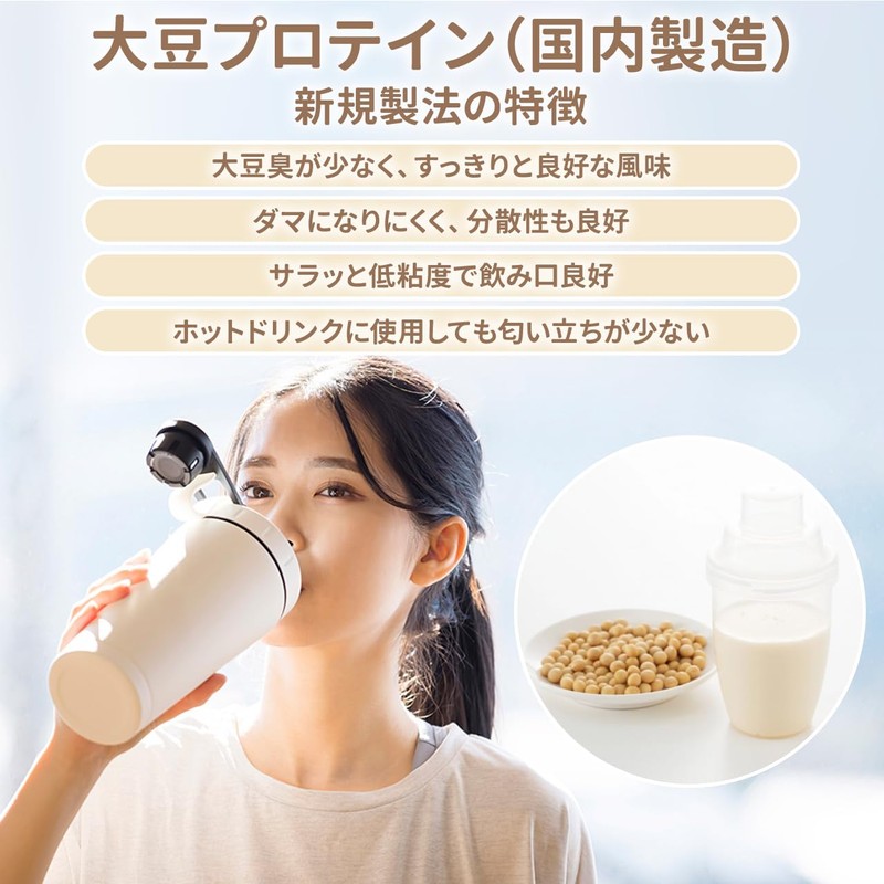- 大豆プロテイン(国内製造)【新規製法ソイプロテイン】 植物性のタンパク質を豊富に含んでいる大豆を原料としたプロテインで、大豆臭をより抑え、水馴染みが早く分散性を更によくした人工甘味料も不使用。大豆プロテインは、分解・吸収に比較的時間がかかり、長時間体内にとどまり、脂肪分が少なくダイエットをサポートするプロテインです。 使用大豆は、IP管理(分別生産流通管理)を使用しております。