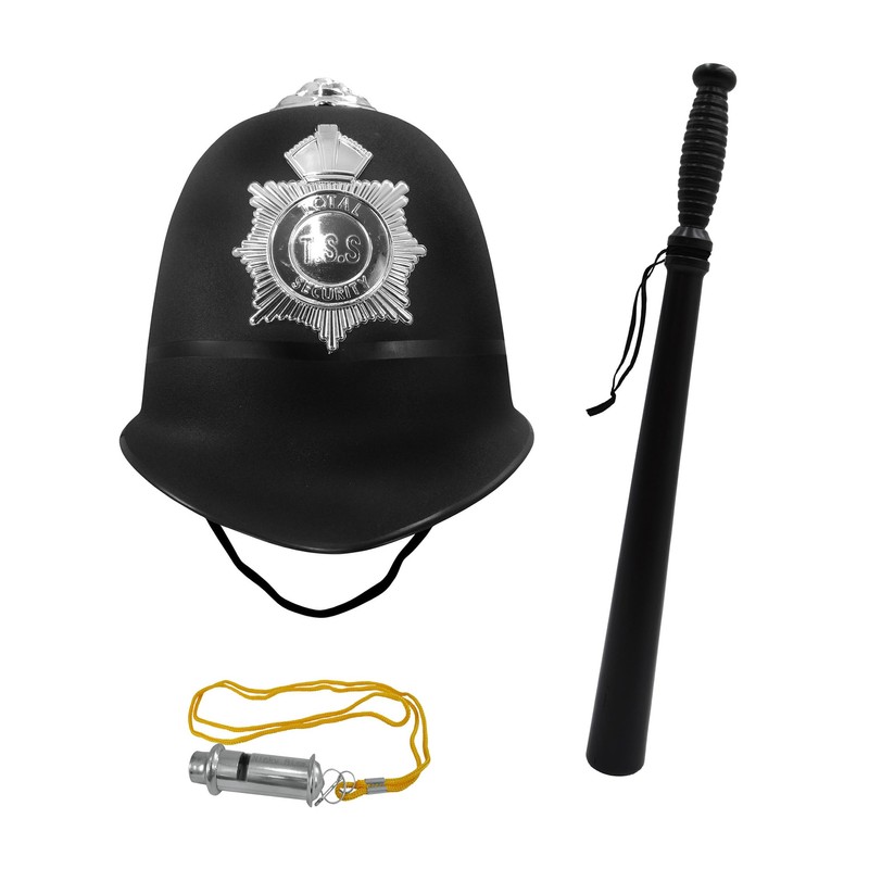 Look like a true British Bobby. Complete with a felt hat and attached badge to represent your official title. Also included is a whistle to catch attention of an ongoing crime. Plus a baton to subdue the criminal. Perfect for Halloween, cosplay, theater, and more! the hat is one size fits most up to 57cm. Hat measures approximately 12" x 9.75" x 9.25". For Ages 14 and Older