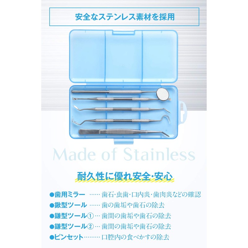 - ✅ 【仕様】安全で高級なステンレス製を採用。歯用ミラー、鎌形ツール①②、鍬型ツール、ピンセット。
