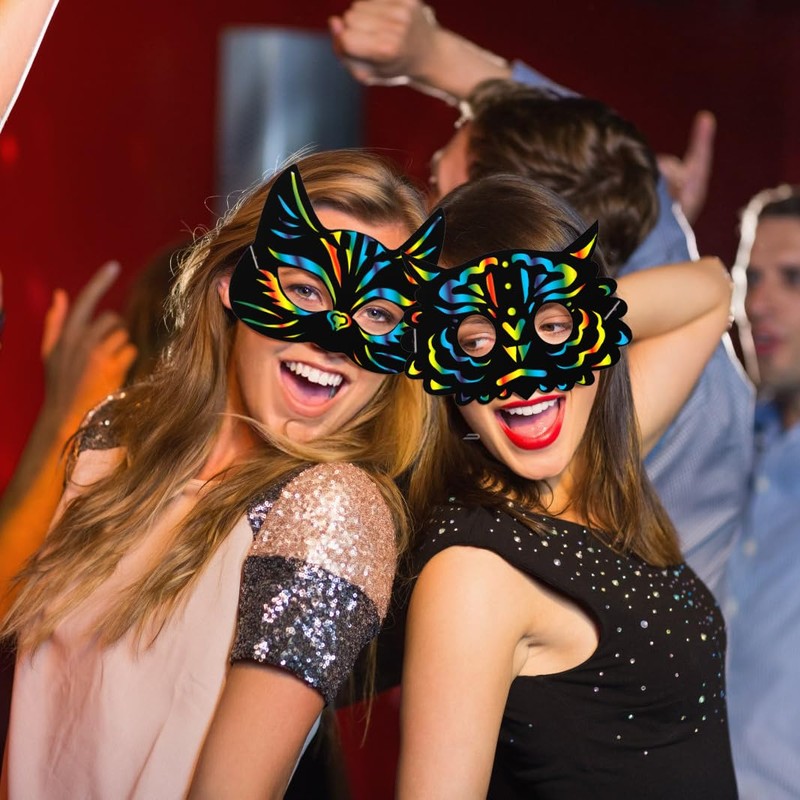 - 【Safe Material】Halloween craft scratch masks are made of high quality thick paper. Wooden stylus can scratch off the black coating that reveals brilliant rainbow colors when scratched. Black ropes are elastic, easily fit the head of kids and adults.