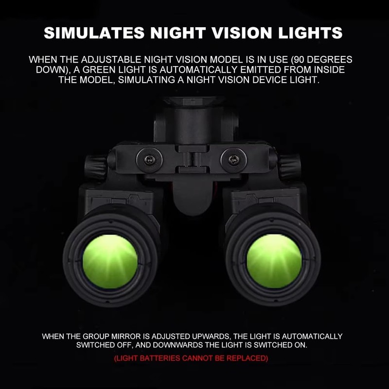 - When using the Dummy Model night vision device, as it tilts downwards to 90 degrees, the internal mechanism triggers the emission of a green light, simulating the glow of night vision goggles. (powered by non-replaceable batteries), as the device is adjusted upwards, the light automatically shuts off