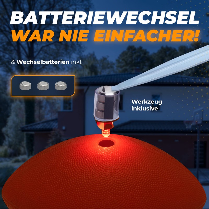 - Sensor activated LEDs – if the ball (variant LB08-EU) bounces, two LEDs light up inside the ball. After 30 seconds without vibration, they turn off. The batteries last for approx. 30 hours. Lighting time!