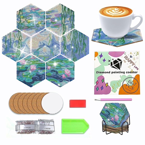 NIHO-JIUMA Diamond Painting Coasters Kits, 7 PCS Hexagon Coasters Monet Water Lily Diamond Art Coasters for Beginners Adults