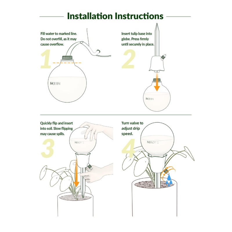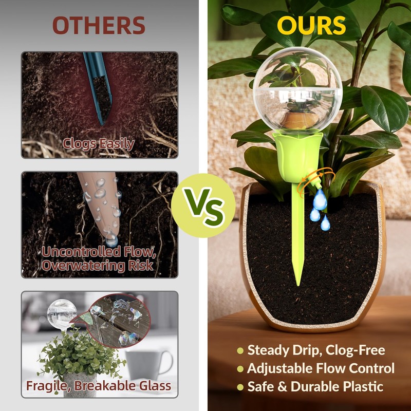 - Eco-Friendly & Easy to Use: No batteries or complex installation required. These automatic watering devices rely on gravity and soil absorption to deliver consistent moisture. A sustainable and simple way to maintain healthy plants—just refill and insert into the soil.