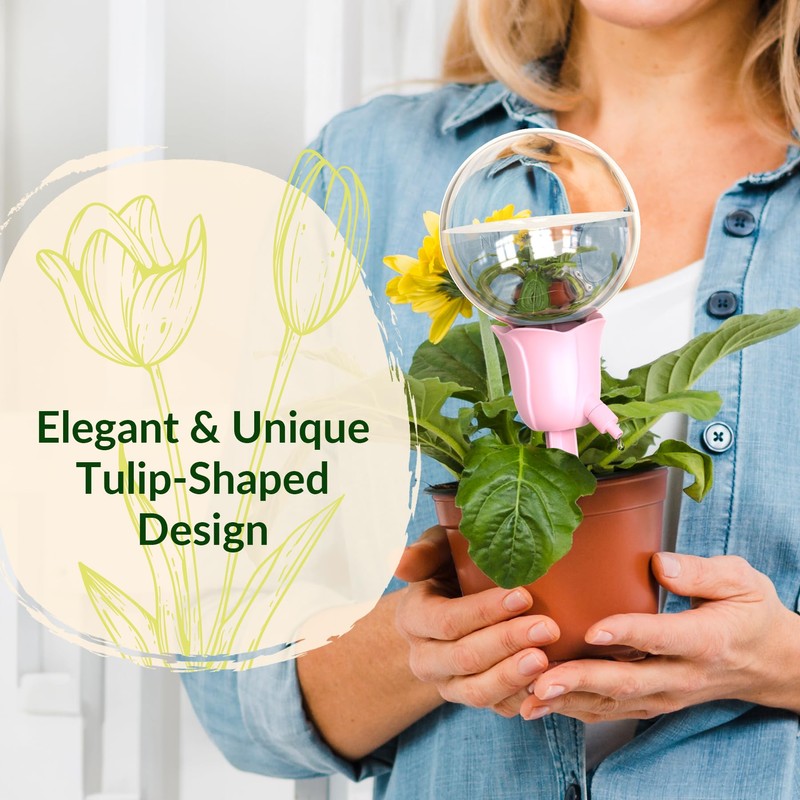 - Elegant & Durable Design: Crafted from high-quality transparent plastic, the self watering bulbs are both durable and decorative. The tulip-inspired support rods add a touch of elegance while blending seamlessly with your home or office décor. Functional beauty for any plant setup.