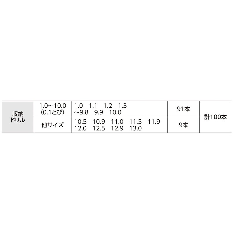 - 1.0~10.0(0.1とび)、10.5、10.9、11.0、11.5、11.9、12.0、12.5、12.9、13.0(計100本収納可能)