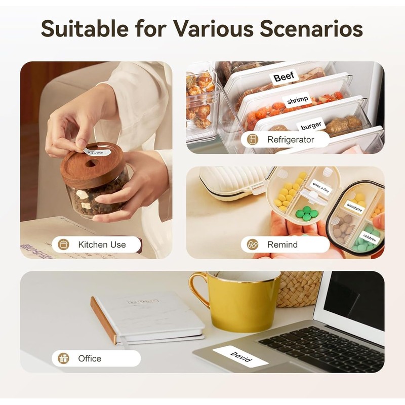 • 【Wide Application】- The label maker machine with tapes is widely used in organizing home/small business supplies, school stuffs,and office files classification.You can use it in food/kitchen/clothing storage,item identification,kids toys and plant pot labeling.For office, such as notebook tags, office items tags, reminder tags.For school, label maker could be used for teacher and kids school items, name tags.