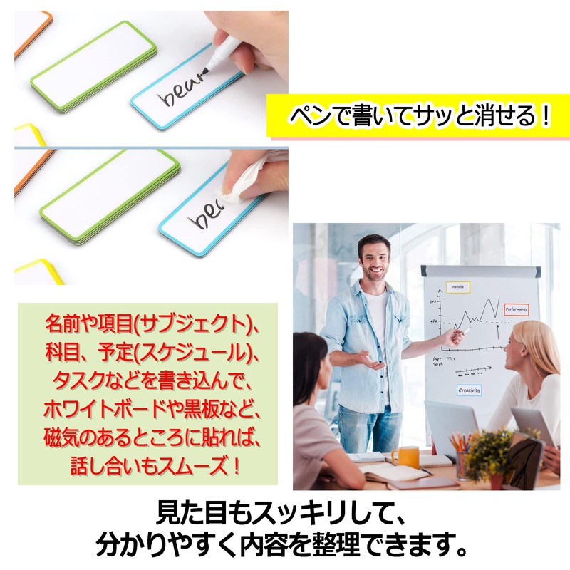 Write with a pen and erase it quickly. Write on names, items (subjects), subjects, appointments (schedules), tasks and more, and stick them on magnetic surfaces such as whiteboards and chalkboards for a smooth discussion. It looks clean and keeps contents organized and easy to understand.