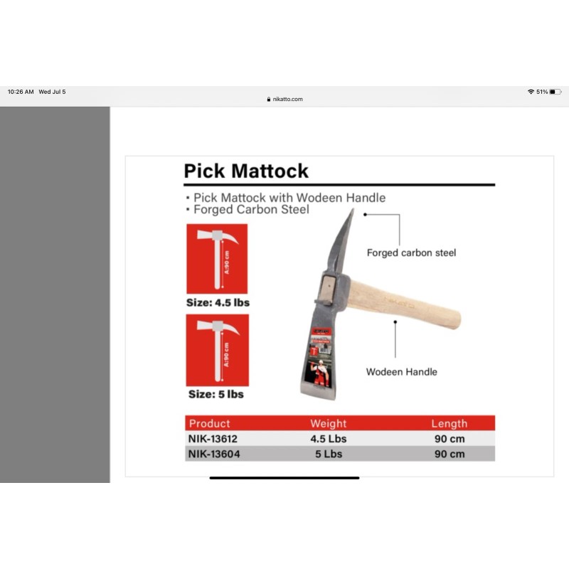 NIKATTO Pick Mattock 4.5 and 5 lbs, Wodeen Handle, Forged Carbon Steel. USA STOCK - 4.5LBS