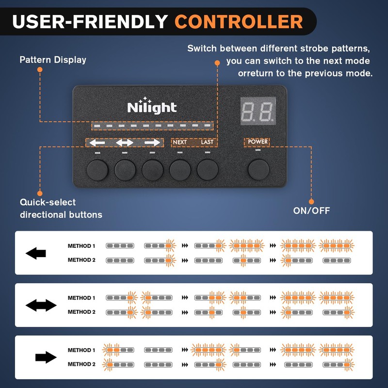 - FLASHING PATTERNS: Choose from 26 different flicker modes, just plug in the 12V cigarette lighter switch, you can control the desired strobe mode through the display handle, including steady on, alternating blinking, fast blinking, etc. It also has a memory function, and can still use the mode before closing after re-opening.