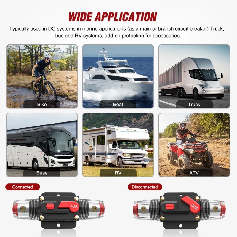 - Protect your system: The circuit breaker can protect car audio, low-voltage, and high-current electrical equipment from current overload damage. Allow to charge or maintain the battery without having to disconnect all the wires.
