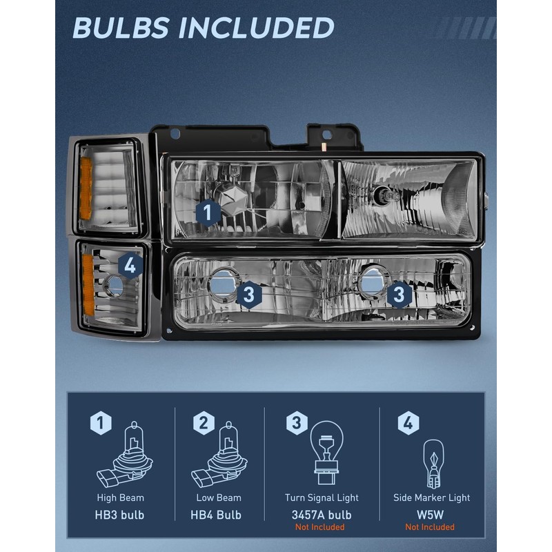 - Package Includes: 1 pair of headlight and taillight (driver side and passenger side).The bulbs are NOT included