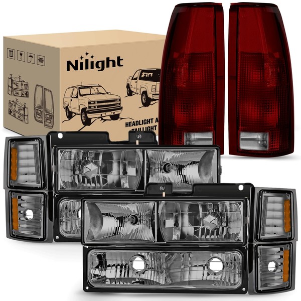 Nilight Headlight and Taillight Assembly Combo Compatible with 1994 1995 1996 1997 1998 Chevy Silverado Tahoe Suburban C10 C/K 1500 2500 3500 Tail Light Chrome Housing Amber Reflector Smoke Lens