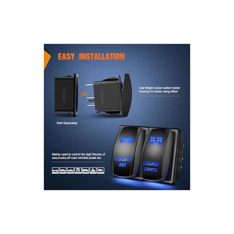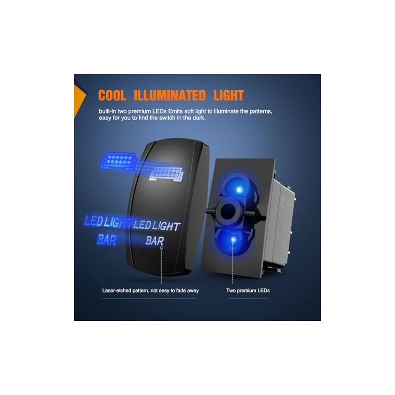 - Wide Application: Standard 5 Pin switch, rated at 20amp/12VDC and 10amp/24VDC, available for upgrading most wiring harness to control Rear Lights, Rock Lights, Led Light Bar, Led Work Lights, Fog Lamps, Headlights, Taillights and Auxiliary Lamps, etc