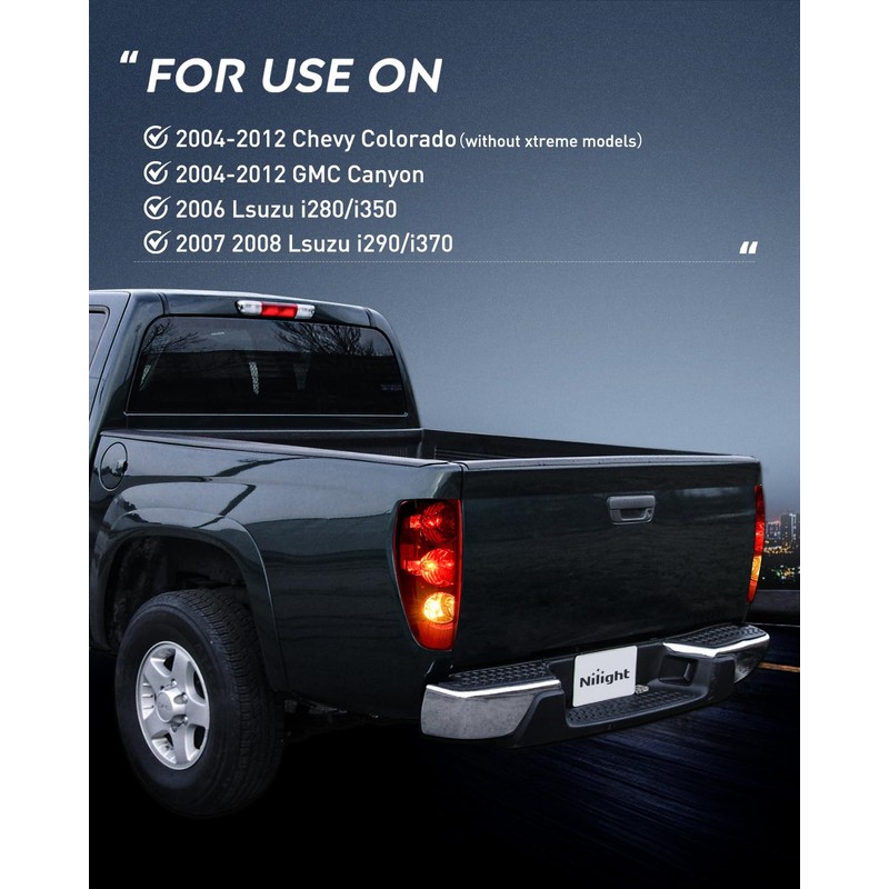 - Compatibility: The taillight assemblies are compatible with 2004-2012 Chevy Colorado(without xtreme models);2004-2012 GMC Canyon;2006 Lsuzu i280 i350;2007 2008 Lsuzu i290 i370. Please confirm the vehicle fitment before ordering.