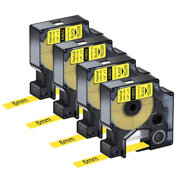 Nineleaf 4 PK Compatible for DYMO 18052 Rhino Heat Shrink Tube Industry Label Tape 1/4" x 5ft Black on Yellow for LabelWriter and Industrial Label Maker Rhino 1000 3000 4200 5000 5200 6000 450 Duo