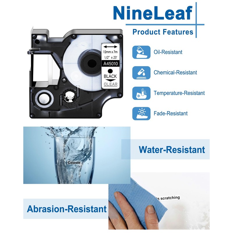 NineLeaf 6 Pack Replacement for Dymo D1 45010 S0720500 A45010 12 mm x 7 m 0.47 Inch Tapes Black on Transparent Label Tape for LabelManager 160 210D 220P LabelPoint 100 150 200 250 Labelling Device