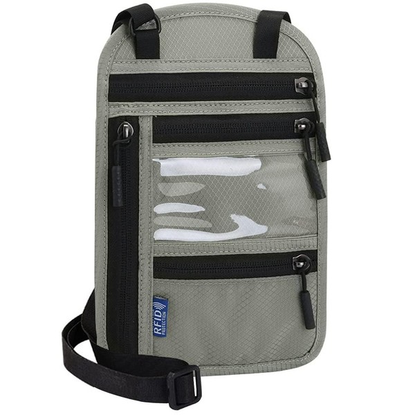 NINOMO Funda para Pasaporte para el Cuello, Cartera de Viaje Anti Robo para Pasaporte, con Bloqueo Rfid, Gran Capacidad y Diseño Multibolsillo, Tejido Impermeable, para Tarjeta y Pasaporte(Gris)