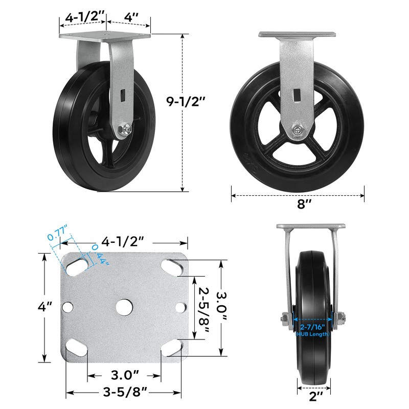 - Perfect Size: 8" X 2" caster wheels are easy to install and won't take up too much of your time. The heavy-duty industrial caster set of 4 has an overall height of 9-1/2".