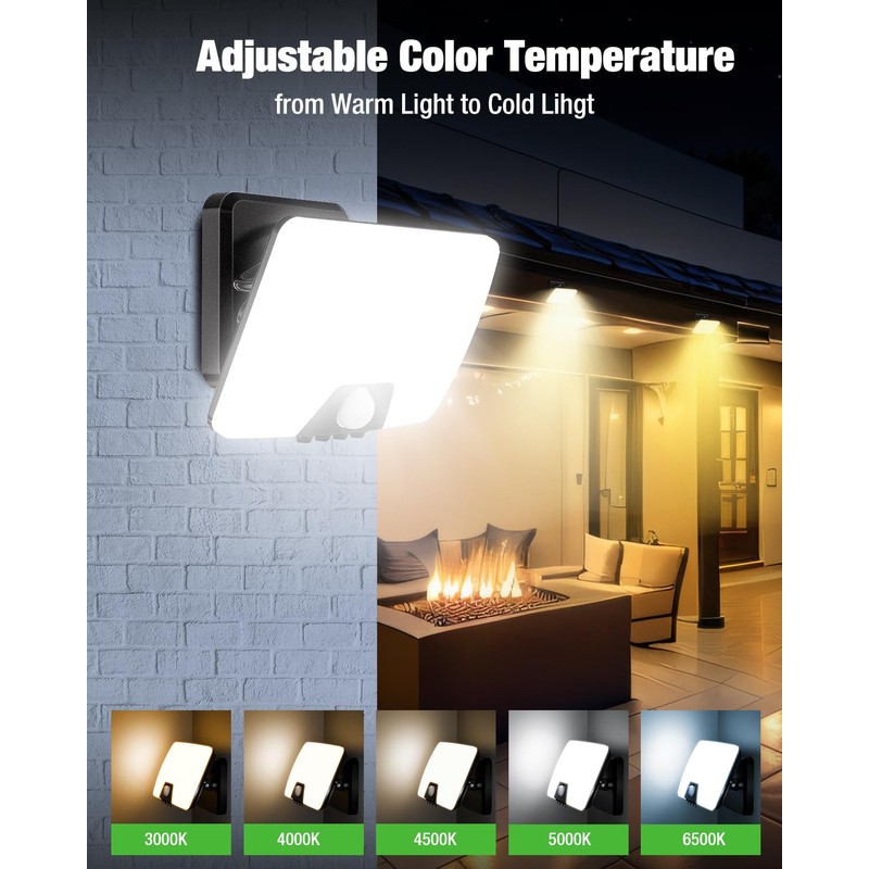 - CCT outdoor lamp with motion sensor: improved version of the outdoor lighting with motion sensor power, floodlight. You can choose 3000-6500K. you can adjust the colour temperature according to your application scenario. You can adjust it via the "CCT" button, different colour temperatures bring you different atmospheres and brighten up your home